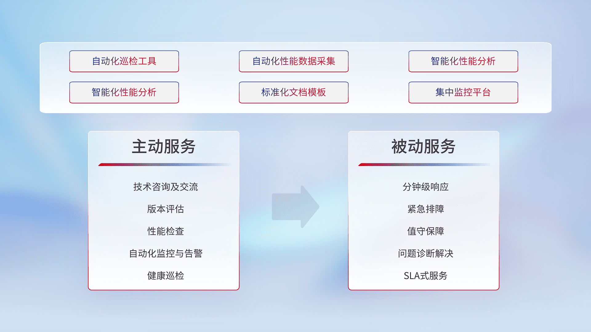 智能化工具和标准化文档,,保障服务质量,,提供主动服务(包含技术咨询、、、版本评估、、、性能检查、、、自动化监控与告警、、、健康巡检)和被动服务包含(分钟级响应、、、紧急排障、、、、值守保障、、、问题诊断解决、、SLA服务)。。